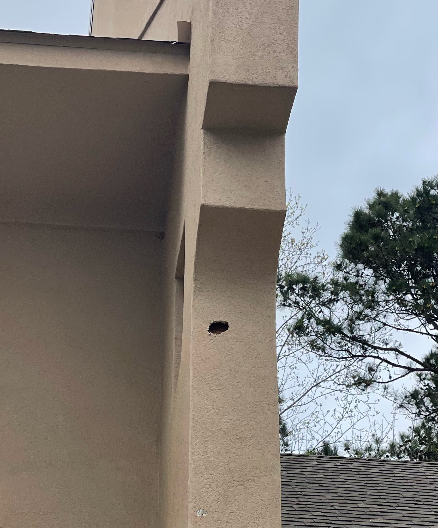 Woodpecker damage to stucco exterior wall
